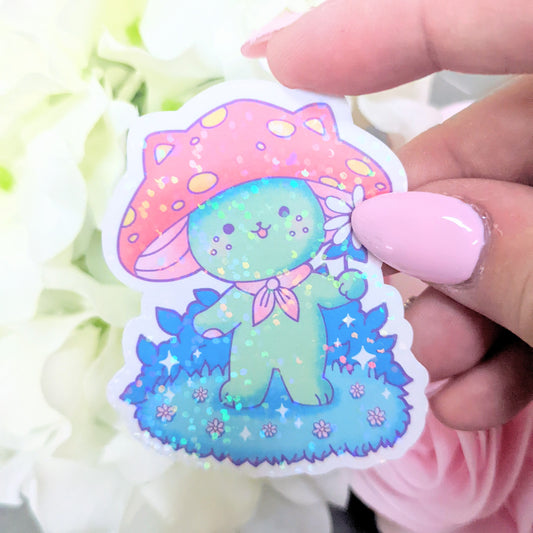 Green Boba with Nova the Mushroom Cute Holographic Sticker